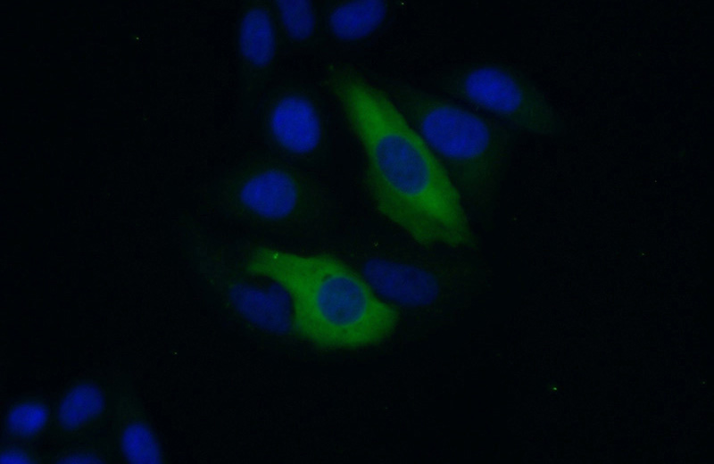Immunofluorescent analysis of (10% Formaldehyde) fixed HepG2 cells using Catalog No:111620(IFIT3 Antibody) at dilution of 1:50 and Alexa Fluor 488-congugated AffiniPure Goat Anti-Rabbit IgG(H+L)
