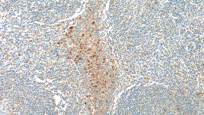 Immunohistochemistry of paraffin-embedded human tonsillitis tissue slide using Catalog No:107390(IL2 Antibody) at dilution of 1:800 (under 40x lens). Heat mediated antigen retrieved with Tris-EDTA buffer, pH9.0