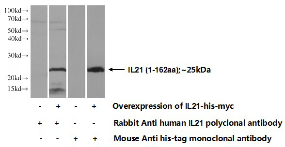 IL21 Rabbit Polyclonal antibody. Positive WB detected in Transfected HEK-293 cells.