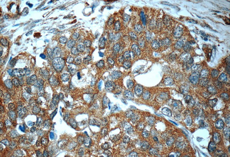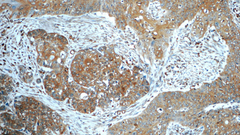Immunohistochemistry of paraffin-embedded human cervical cancer tissue slide using Catalog No:111869(IFNG Antibody) at dilution of 1:50 (under 40x lens)