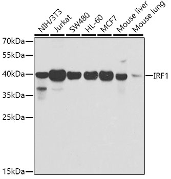 Western blot analysis of extracts of various cell lines, using IRF1 antibody at 1:500 dilution.Secondary antibody: HRP Goat Anti-Rabbit IgG (H+L) at 1:10000 dilution.Lysates/proteins: 25ug per lane.Blocking buffer: 3% nonfat dry milk in TBST.Detection: ECL Enhanced Kit .Exposure time: 90s.