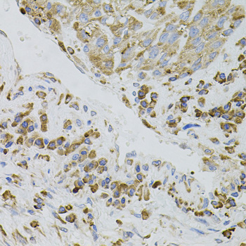 Immunohistochemistry of paraffin-embedded human lung cancer using IRF1 antibody (40x lens).