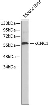 Western blot analysis of extracts of mouse liver, using KCNC1 antibody .Secondary antibody: HRP Goat Anti-Rabbit IgG (H+L) at 1:10000 dilution.Lysates/proteins: 25ug per lane.Blocking buffer: 3% nonfat dry milk in TBST.