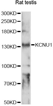 Western blot analysis of extracts of rat testis, using KCNU1 antibody at 1:1000 dilution.Secondary antibody: HRP Goat Anti-Rabbit IgG (H+L) at 1:10000 dilution.Lysates/proteins: 25ug per lane.Blocking buffer: 3% nonfat dry milk in TBST.Detection: ECL Basic Kit .Exposure time: 90s.