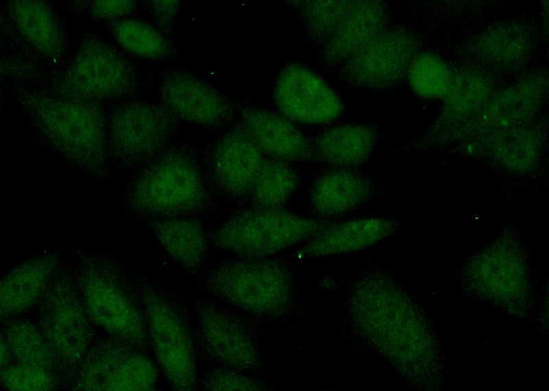 Immunofluorescent analysis of (10% Formaldehyde) fixed HeLa cells using Catalog No:112029(KDM5C Antibody) at dilution of 1:50 and Alexa Fluor 488-congugated AffiniPure Goat Anti-Rabbit IgG(H+L)