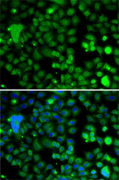 Immunofluorescence analysis of A-549 cells using KLF9 antibody . Blue: DAPI for nuclear staining.