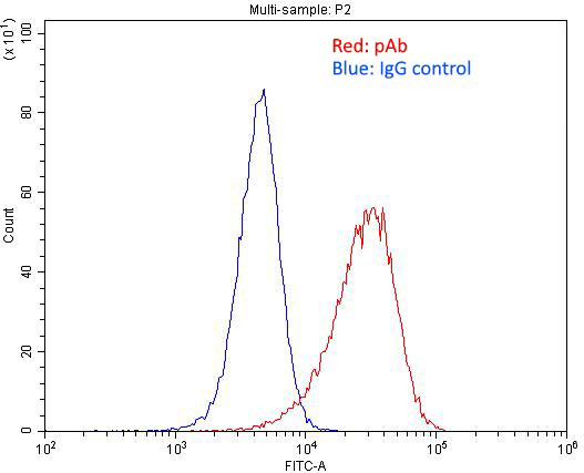 1X10^6 HeLa cells were stained with .2ug LDLR antibody (Catalog No:112188, red) and control antibody (blue). Fixed with 4% PFA blocked with 3% BSA (30 min). Alexa Fluor 488-congugated AffiniPure Goat Anti-Rabbit IgG(H+L) with dilution 1:1500.