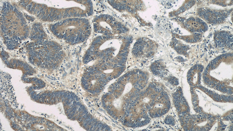 Immunohistochemical of paraffin-embedded human colon cancer using Catalog No:112188(LDLR antibody) at dilution of 1:50 (under 10x lens)
