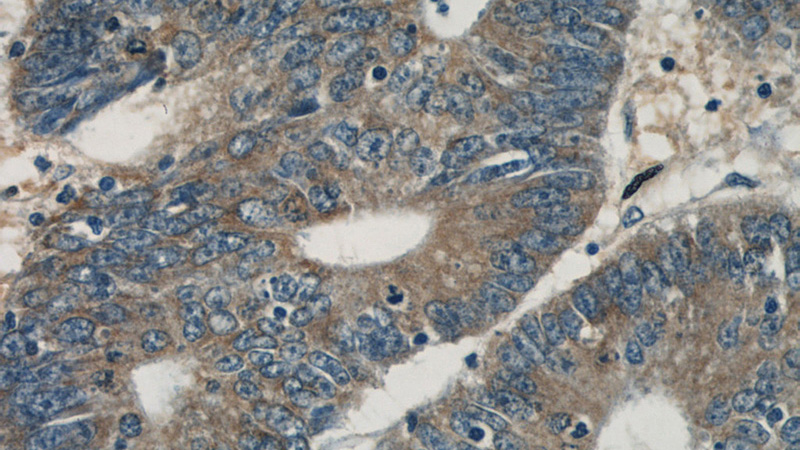 Immunohistochemical of paraffin-embedded human colon cancer using Catalog No:112188(LDLR antibody) at dilution of 1:50 (under 40x lens)