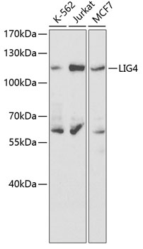 Western blot analysis of extracts of various cell lines, using LIG4 antibody at 1:500 dilution.Secondary antibody: HRP Goat Anti-Rabbit IgG (H+L) at 1:10000 dilution.Lysates/proteins: 25ug per lane.Blocking buffer: 3% nonfat dry milk in TBST.