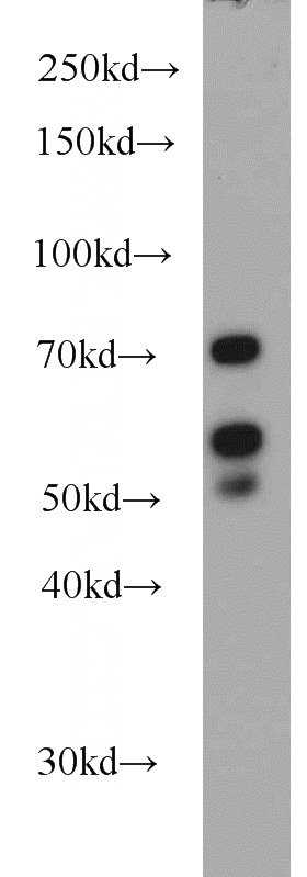 LYN Rabbit Polyclonal antibody. Positive WB detected in HeLa cells, HL-60 cells, Jurkat cells, K-562 cells, L02 cells. Positive IP detected in HeLa cells. Positive IF detected in HeLa cells. Positive IHC detected in human kidney tissue, human hepat℃irrhosis tissue. Positive FC detected in Jurkat cells. Observed molecular weight by Western-blot: 53-56 kDa,66-70 kDa