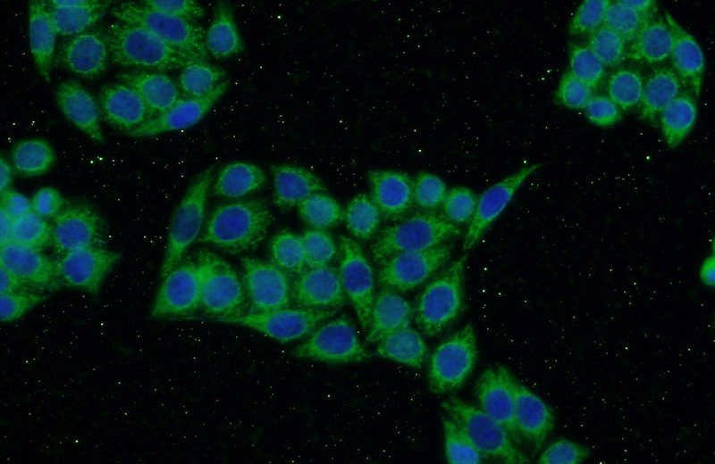 Immunofluorescent analysis of HeLa cells using Catalog No:112407(LYN Antibody) at dilution of 1:50 and Alexa Fluor 488-congugated AffiniPure Goat Anti-Rabbit IgG(H+L)