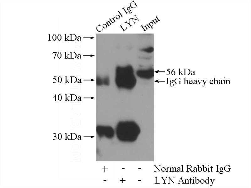 IP Result of anti-LYN (IP:Catalog No:112407, 4ug; Detection:Catalog No:112407 1:1000) with HeLa cells lysate 1200ug.