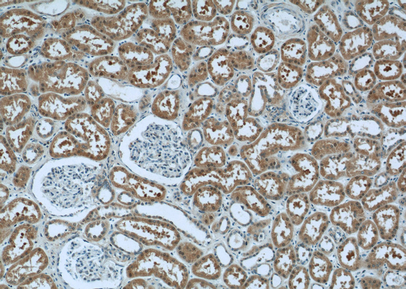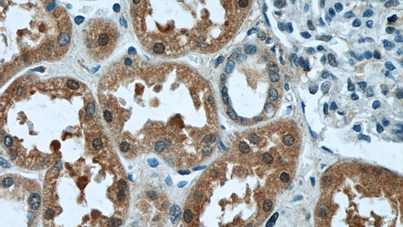 Immunohistochemistry of paraffin-embedded human kidney tissue slide using Catalog No:112407(LYN Antibody) at dilution of 1:50 (under 10x lens)