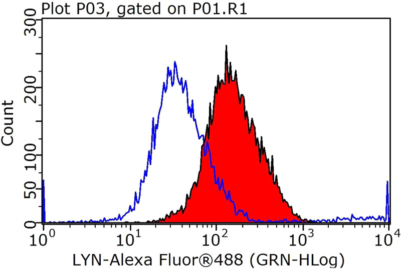 1X10^6 Jurkat cells were stained with 0.2ug LYN antibody (Catalog No:112407, red) and control antibody (blue). Fixed with 90% MeOH blocked with 3% BSA (30 min). Alexa Fluor 488-congugated AffiniPure Goat Anti-Rabbit IgG(H+L) with dilution 1:1000.