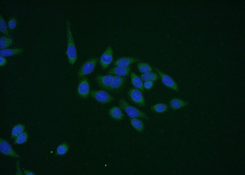 Immunofluorescent analysis of (-20oc Ethanol) fixed HeLa cells using Catalog No:112441(MAPKAPK5 Antibody) at dilution of 1:50 and Alexa Fluor 488-congugated AffiniPure Goat Anti-Rabbit IgG(H+L)