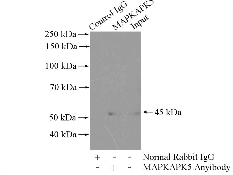 IP Result of anti-MAPKAPK5 (IP:Catalog No:112441, 4ug; Detection:Catalog No:112441 1:500) with HeLa cells lysate 2800ug.