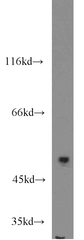HeLa cells were subjected to SDS PAGE followed by western blot with Catalog No:112441(MAPKAPK5 antibody) at dilution of 1:1000