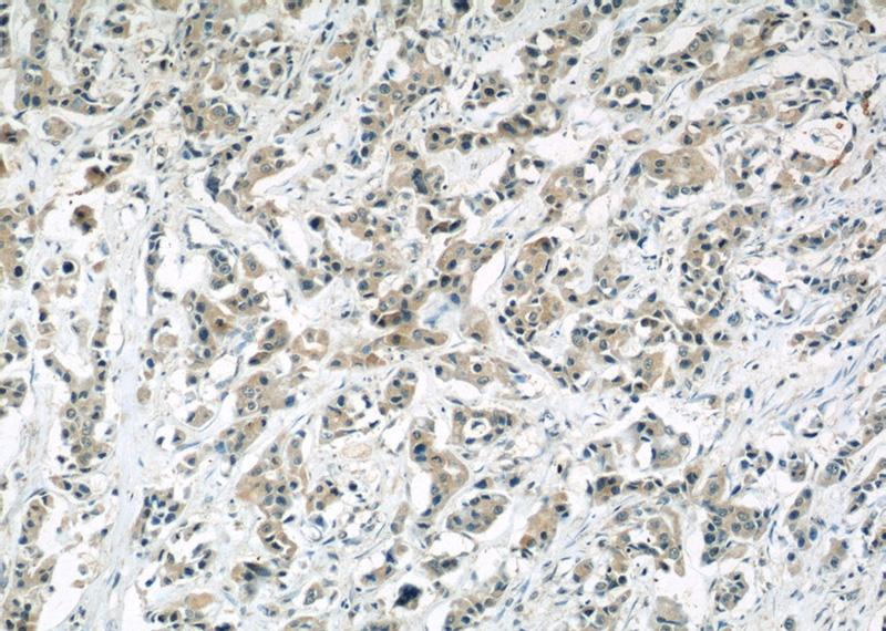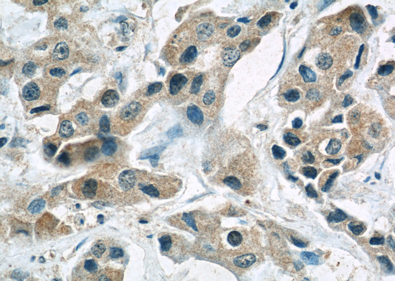 Immunohistochemical of paraffin-embedded human breast cancer using Catalog No:107418(MCL1 antibody) at dilution of 1:50 (under 10x lens)
