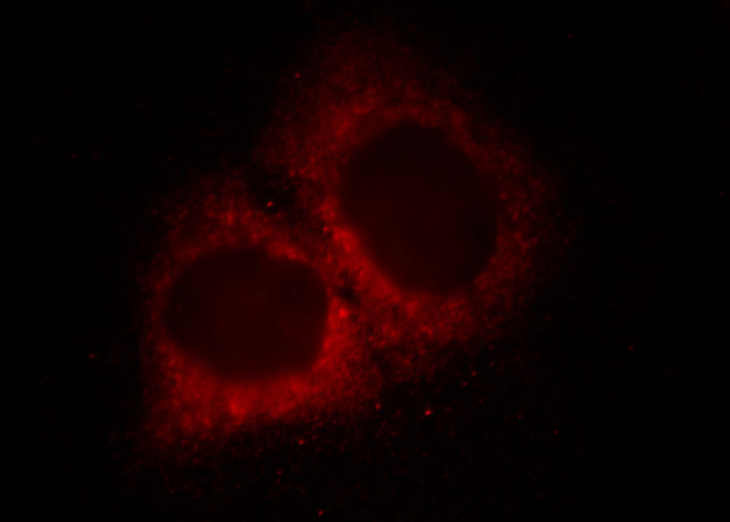 Immunofluorescent analysis of MCF-7 cells, using MCL1 antibody Catalog No: at 1:25 dilution and Rhodamine-labeled goat anti-mouse IgG (red).