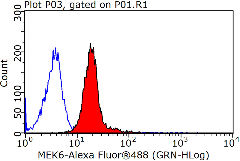 1X10^6 MCF-7 cells were stained with 0.2ug MAP2K6 antibody (Catalog No:112649, red) and control antibody (blue). Fixed with 90% MeOH blocked with 3% BSA (30 min). Alexa Fluor 488-congugated AffiniPure Goat Anti-Rabbit IgG(H+L) with dilution 1:1500.