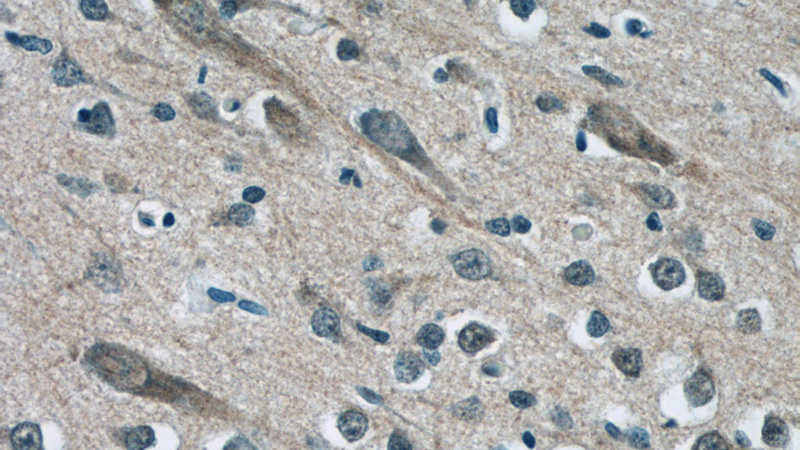 Immunohistochemistry of paraffin-embedded human brain tissue slide using Catalog No:112534(MFSD8 Antibody) at dilution of 1:50 (under 10x lens)