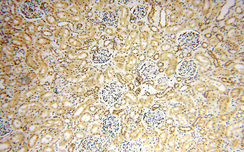 Immunohistochemical of paraffin-embedded human kidney using Catalog No:112603(MGMT antibody) at dilution of 1:100 (under 10x lens)