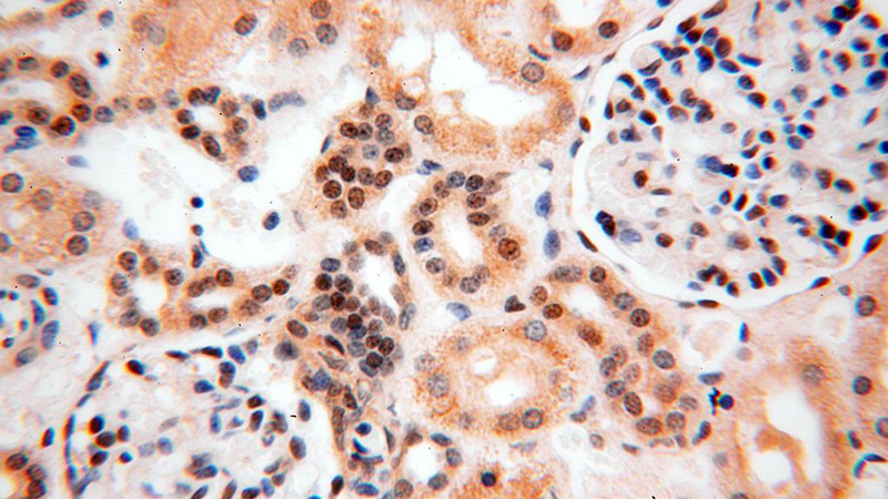 Immunohistochemical of paraffin-embedded human kidney using Catalog No:112603(MGMT antibody) at dilution of 1:100 (under 40x lens)