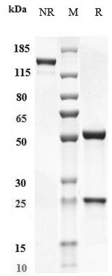 Anti-IL-23 Antibody (mirikizumab) on SDS-PAGE under reducing (R) condition. The purity of the protein is greater than 90%.