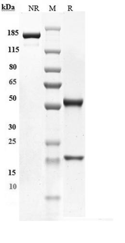 Anti-B7-H3 / CD276 Antibody (mirzotamAb) on SDS-PAGE under reducing (R) condition. The purity of the protein is greater than 90%.