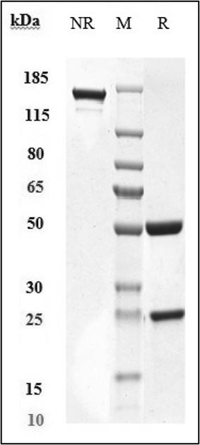 Anti-CCR4 / CD194 Antibody (mogamulizumab) on SDS-PAGE under reducing (R) condition. The purity of the protein is greater than 90%.