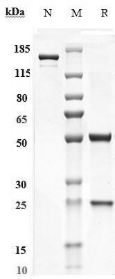 Anti-RSV-F Antibody (motavizumab) on SDS-PAGE under reducing (R) condition. The purity of the protein is greater than 95%.