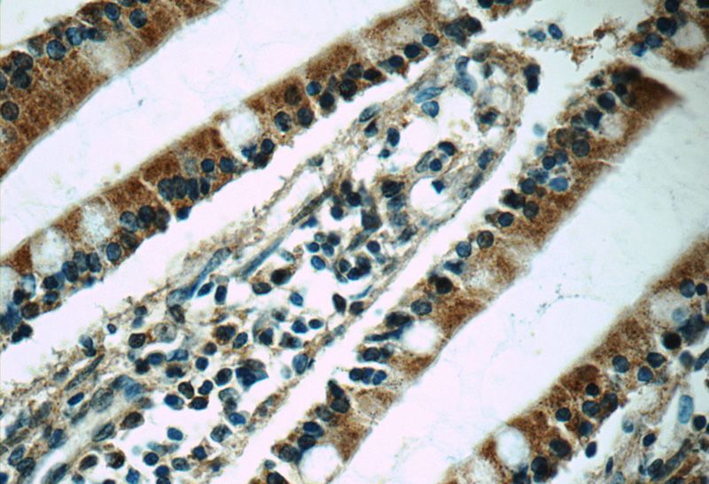 Immunohistochemistry of paraffin-embedded human small intestine tissue slide using Catalog No:112806(ABCC2 Antibody) at dilution of 1:50 (under 40x lens)