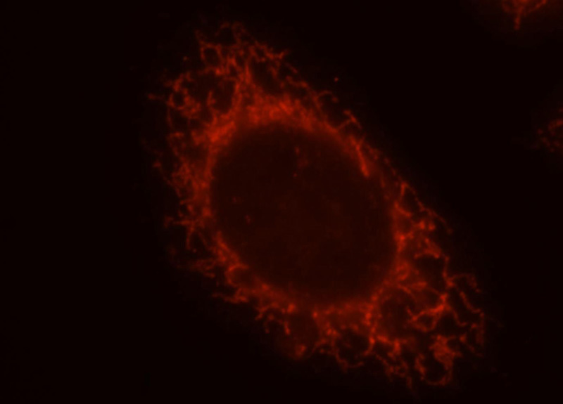 Immunofluorescent analysis of HepG2 cells, using MRPS27 antibody Catalog No:112854 at 1:25 dilution and Rhodamine-labeled goat anti-rabbit IgG (red).