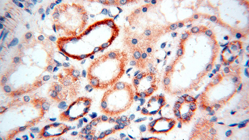 Immunohistochemical of paraffin-embedded human kidney using Catalog No:112854(MRPS27 antibody) at dilution of 1:100 (under 40x lens)
