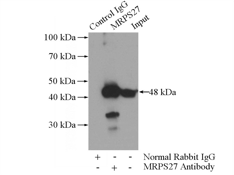 IP Result of anti-MRPS27 (IP:Catalog No:112854, 3ug; Detection:Catalog No:112854 1:1000) with A431 cells lysate 1520ug.