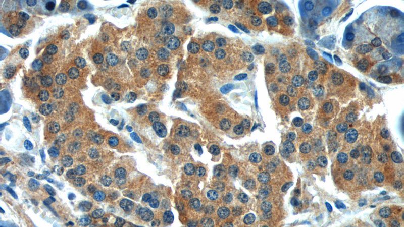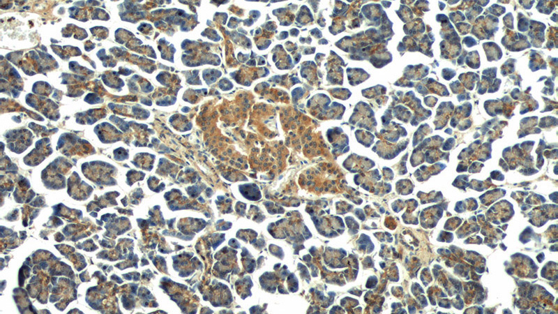 Immunohistochemistry of paraffin-embedded human pancreas tissue slide using Catalog No:112795(MTR Antibody) at dilution of 1:50 (under 10x lens)