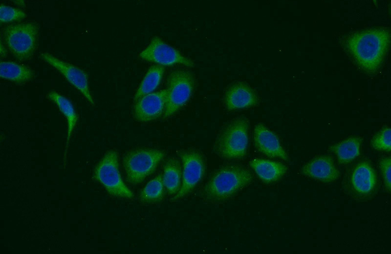 Immunofluorescent analysis of PC-3 cells using Catalog No:112906(MVK Antibody) at dilution of 1:25 and Alexa Fluor 488-congugated AffiniPure Goat Anti-Rabbit IgG(H+L)