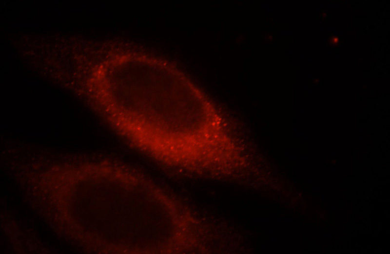 Immunofluorescent analysis of HepG2 cells, using MYLK antibody Catalog No:112972 at 1:25 dilution and Rhodamine-labeled goat anti-rabbit IgG (red).