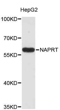 Western blot analysis of extracts of HepG2 cells, using NAPRT antibody .Secondary antibody: HRP Goat Anti-Rabbit IgG (H+L) at 1:10000 dilution.Lysates/proteins: 25ug per lane.Blocking buffer: 3% nonfat dry milk in TBST.