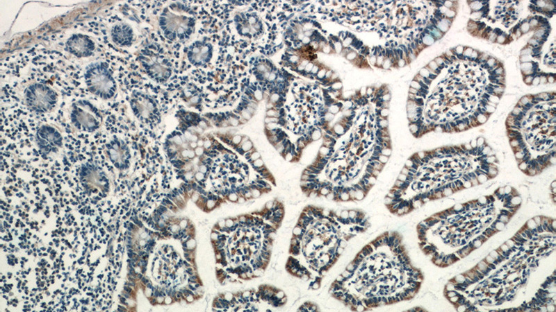 Immunohistochemistry of paraffin-embedded human small intestine tissue slide using Catalog No:107320(NAPRT1 Antibody) at dilution of 1:50 (under 10x lens)