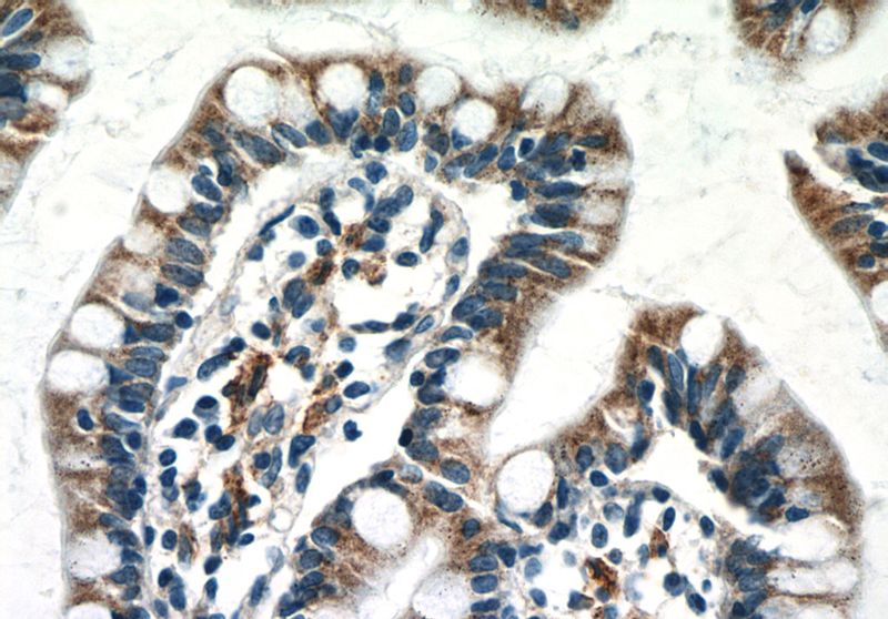 Immunohistochemistry of paraffin-embedded human small intestine tissue slide using Catalog No:107320(NAPRT1 Antibody) at dilution of 1:50 (under 40x lens)