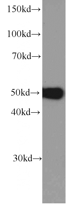 HeLa cells were subjected to SDS PAGE followed by western blot with Catalog No:107320(NAPRT1 Antibody) at dilution of 1:1500