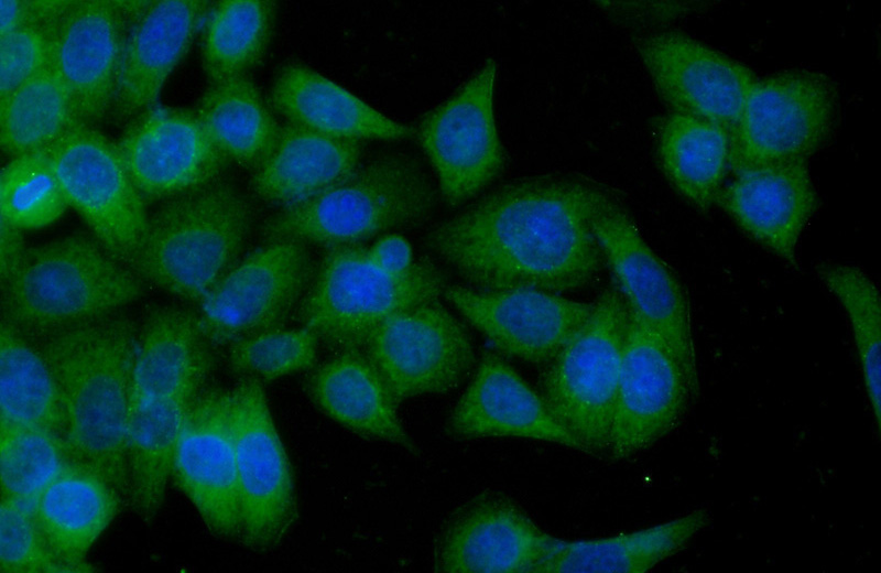 Immunofluorescent analysis of (-20oc Ethanol) fixed HeLa cells using Catalog No:107320(NAPRT1 Antibody) at dilution of 1:100 and Alexa Fluor 488-congugated AffiniPure Goat Anti-Mouse IgG(H+L)