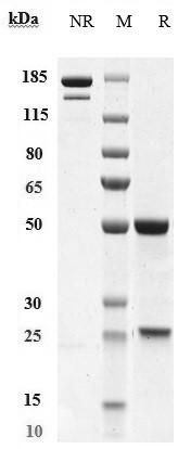 Anti-MASP2 Antibody (narsoplimab) on SDS-PAGE under reducing (R) condition. The purity of the protein is greater than 95%.