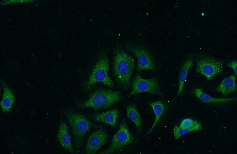 Immunofluorescent analysis of (-20oc Ethanol) fixed SH-SY5Y cells using Catalog No:112965(NBAS Antibody) at dilution of 1:50 and Alexa Fluor 488-congugated AffiniPure Goat Anti-Rabbit IgG(H+L)