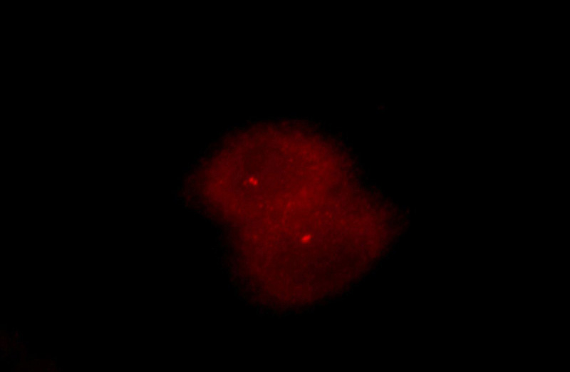 Immunofluorescent analysis of Hela cells, using NEK2 antibody Catalog No:113103 at 1:25 dilution and Rhodamine-labeled goat anti-rabbit IgG (red).