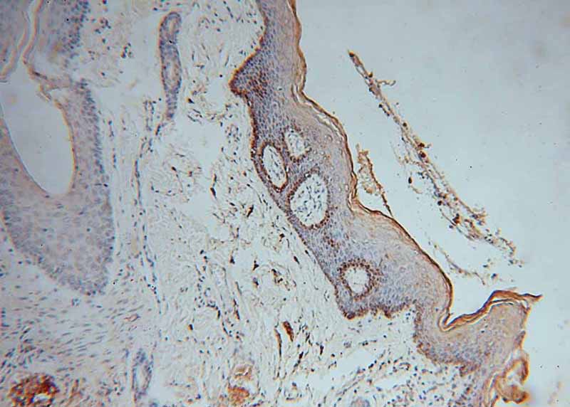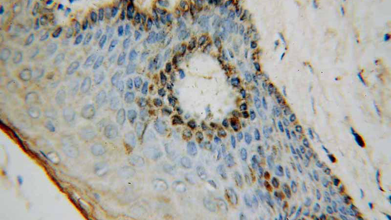 Immunohistochemical of paraffin-embedded human skin cancer using Catalog No:113389(NSUN5 antibody) at dilution of 1:50 (under 10x lens)