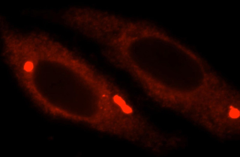Immunofluorescent analysis of HepG2 cells, using NSUN5 antibody Catalog No:113389 at 1:25 dilution and Rhodamine-labeled goat anti-rabbit IgG (red).