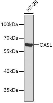 Western blot analysis of extracts of HT-29 cells, using OASL antibody .Secondary antibody: HRP Goat Anti-Rabbit IgG (H+L) at 1:10000 dilution.Lysates/proteins: 25ug per lane.Blocking buffer: 3% nonfat dry milk in TBST.